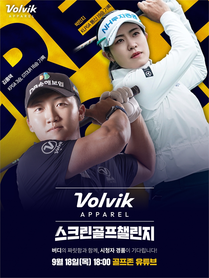 KPGA 김홍택 선수와 KLPGA 박민지 선수가 스크린 대회에 참가한다. ㈜골프존(각자대표이사 박강수·최덕형)이 오는 18일 오후 6시 KPGA, KLPGA 투어에서 활발히 활동 중인 인기 프로 김홍택, 박민지 프로가 참가하는 ‘볼빅어패럴 스크린골프 챌린지’를 방송한다고 17일 밝혔다. 볼빅어패럴 스크린골프 챌린지는