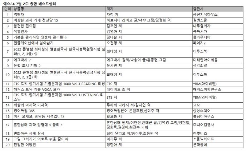다가오는 8월 한국사능력검정시험을 준비하는 수험생들의 열기가 더욱 뜨거워진 한 주였다. <2022 큰별쌤 최태성의 별별한국사 한국사능력검정시험 심화(1, 2, 3급) 상>과 <2022 큰별쌤 최태성의 별별한국사 한국사능력검정시험 심화(1, 2, 3급) 하>는 각각 전주보다 여덟 계단 넘게 올라 금주 7위와 10위를 기록했다. 또한 <ETS 토익 정기시험 기출문제집 1000 Vol.3 READING 리딩>과 <ETS 토익 정기시험 기출문제집 1000 Vol.3 LISTENING 리스닝>이 각각 11위와 13위를 차지하고 <해커스 토익 기출 VOCA 보카>가 12위에 오르는 등 토익 시험을 준비하려는 수험생들의 도서 구매도 이어졌다.