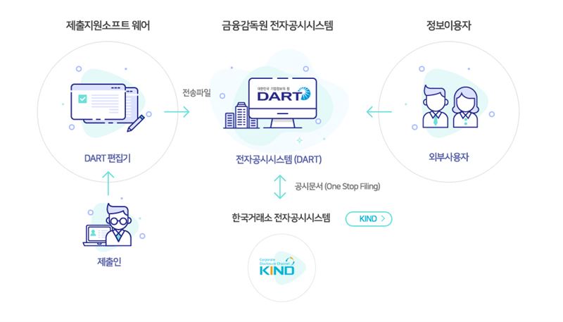 전자공시시스템(DART : Data Analysis, Retrieval and Transfer System)이란 상장법인 등이 공시서류를 인터넷으로 제출하고, 투자자 등 이용자는 제출 즉시 인터넷을 통해 조회할 수 있도록 하는 종합적 기업공시 시스템이다.