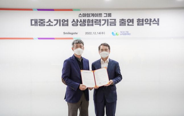 스마일게이트 그룹은 지난 14일 게임업계 최초로 대·중소기업·농어업협력재단과 대·중소기업 상생협력기금 출연 협약을 체결했다고 16일 밝혔다. 이번 협약을 통해 스마일게이트는 기금 130억 원을 출연한다.