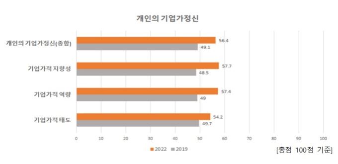 2019년 조사 당시 기업가정신 활성화를 저해하는 요인으로 ‘안정적 직업에 대한 선호’가 가장 많이 꼽혔다. 여기에 코로나19 여파와 국제 정세 악화 등 리스크가 커져 창업 의지 감소가 장기화된 것으로 풀이된다.