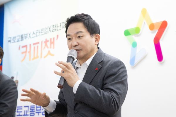 커피챗 행사는 다양한 국토교통 신산업을 주제로 정기적으로 원 장관과 새싹기업 대표, 예비창업가, 청년 등이 직접 만나 모닝커피를 마시며 자유롭게 각자의 경험을 공유하고, 다양한 의견을 나누는 자리다. 제7회 커피챗 행사는 스마트건설을 주제로 진행됐다.