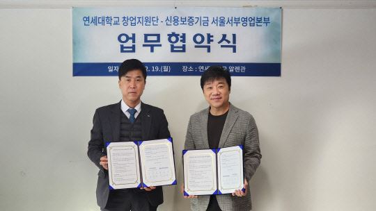 연세대학교 창업지원단은 신용보증기금 서울서부영업본부와 지난 19일 연세대 알렌관에서 '우수 창업기업 육성 및 일자리 창출을 위한 업무협약식'을 열어 업무협약(MOU)을 체결하고 앞으로 다양한 협업을 진행하기로 했다고 28일 밝혔다. 이번 협약을 통해 연세대 창업지원단이 발굴하고 보육하는 우수 창업기업은 추천 과정을 통해 신용보증기금의 보증 비율 및 보증료 우대를 받을 수 있게 됐다.