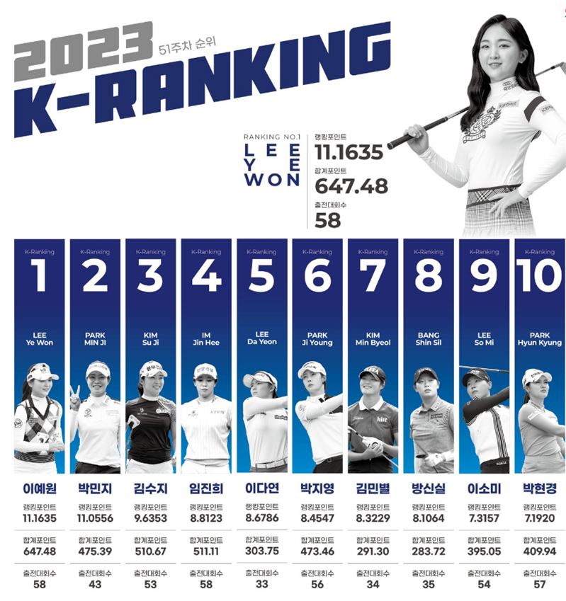 이예원은 지난 8월 ‘두산건설 We’ve 챔피언십 우승’에서 우승하면서 K랭킹 2위에 올라섰다. 특히, K랭킹은 104주(2년)간의 성적을 반영하되 최근 13주 성적에 더 큰 비중을 두고 있어 2023시즌 하반기까지 꾸준한 활약을 펼친 이예원이 지금까지도 많은 포인트를 획득하고 있으며 격차를 더 벌릴 수 있는 상황이다.