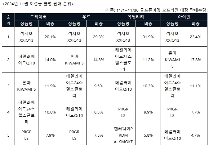 여성용 클럽에서 드라이버 판매 순위는 1위 젝시오 XXIO 13 순으로 집계됐다. 특이할 만한 사항으로는 여성들은 드라이버 뿐 아니라 우드, 유틸리티, 아이언 모두 XXIO 13을 선호하는 것으로 나타났다. 이는 남성들과 달리 세트구매가 일반화 되어 있는 탓으로 분석된다.